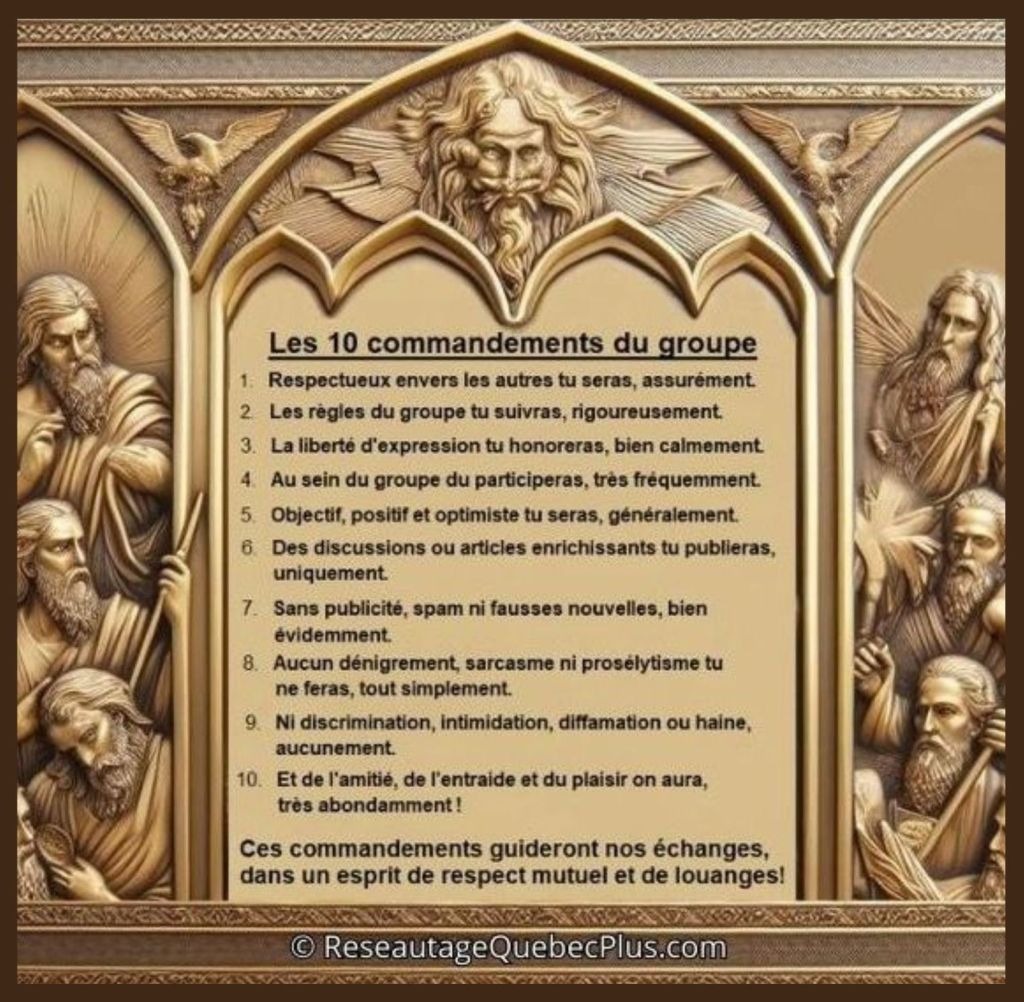 Sur une note humoristique, voici un rappel des 10 COMMANDEMENTS du groupe RÉSEAUTAGE QUÉBEC PLUS! Prière de suivre ceux-ci religieusement pour ne pas risquer d'être excommunié(e) ! 😀 1. Resp...